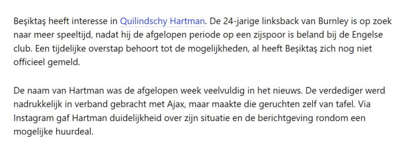 Haberde, Hartman'ın Feyenoord altyapısından yetiştiğine dikkat çekilerek, "Hartman Beşiktaş'ta Orkun Kökçü ile yeniden buluşabilir" yorumu yapıldı. İki oyuncu, Feyenoord günlerinden birbirini yakından tanıyor.
